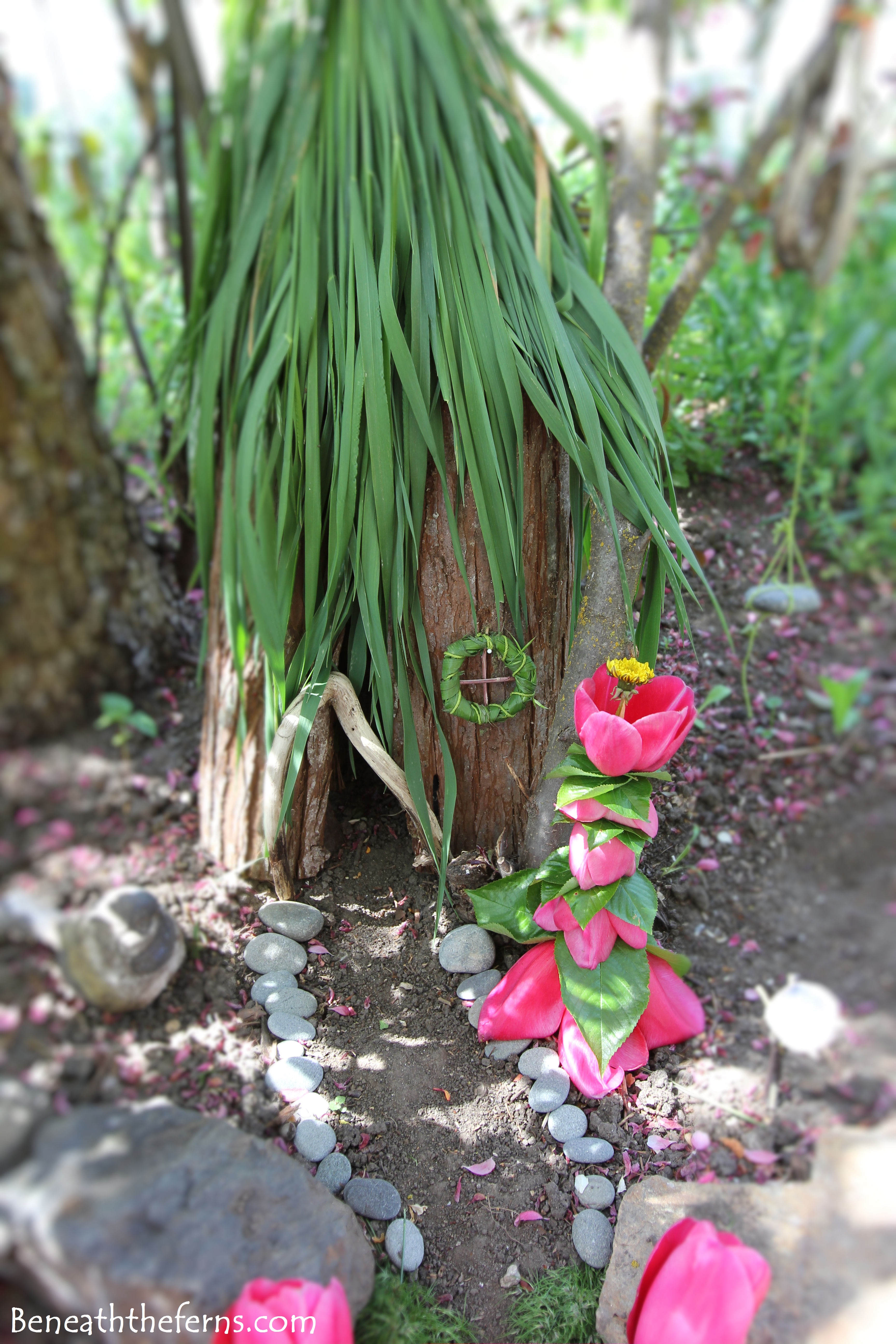 My two nieces recently came over, and had a fun time helping me create a fairy house and lots of accessories for the fairies to enjoy. The tulips were in full bloom, and make a colorful addition to the fairy garden.