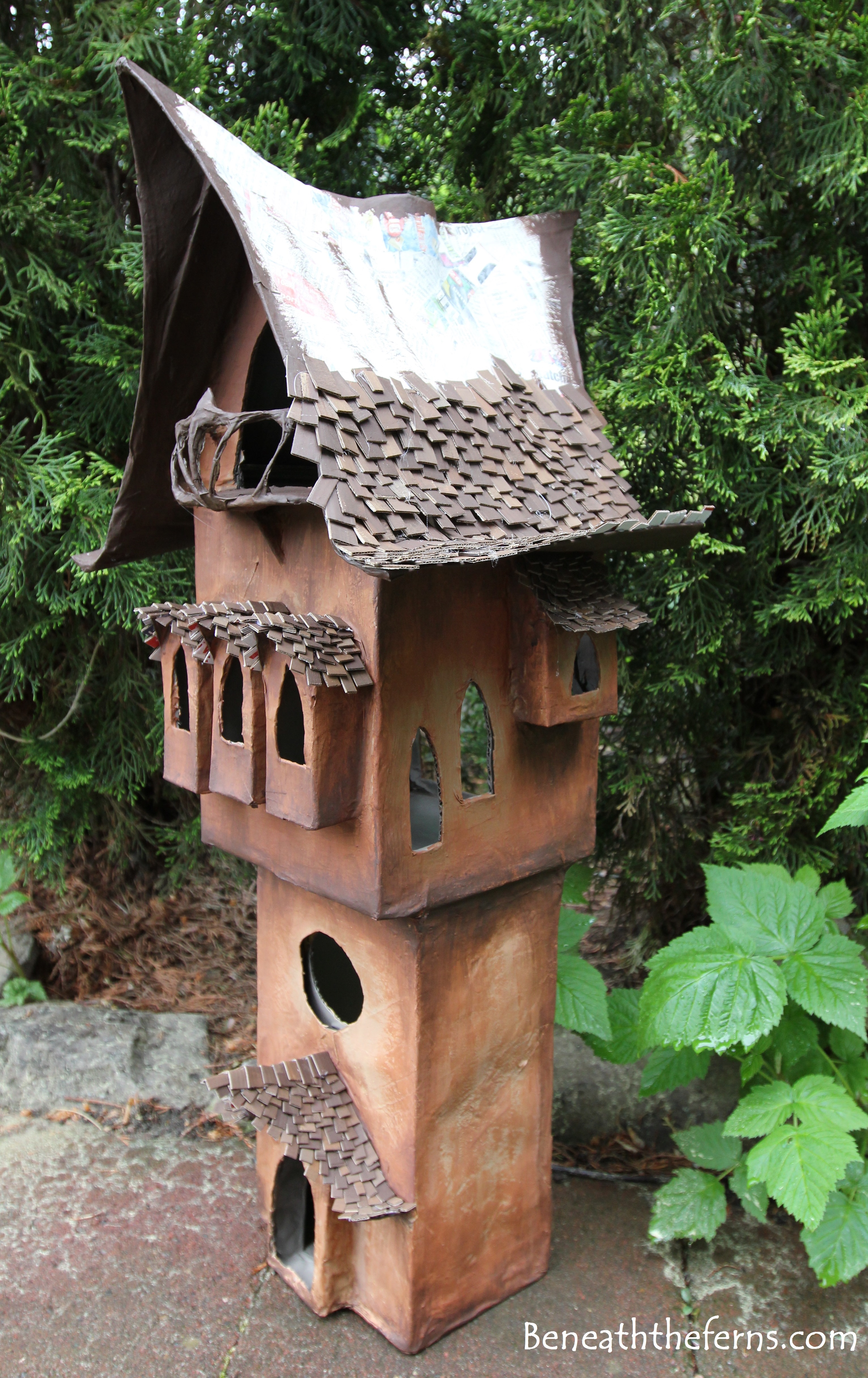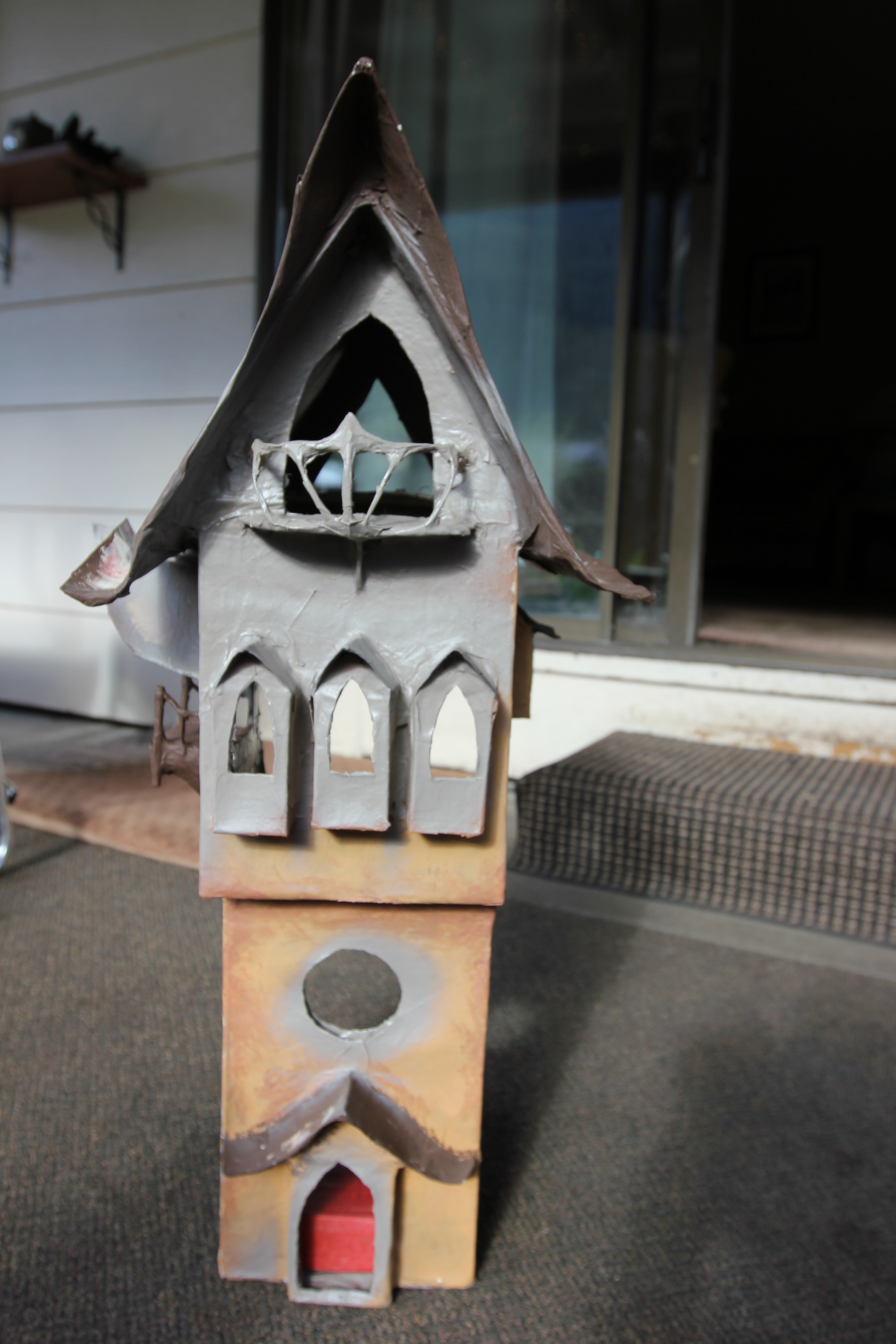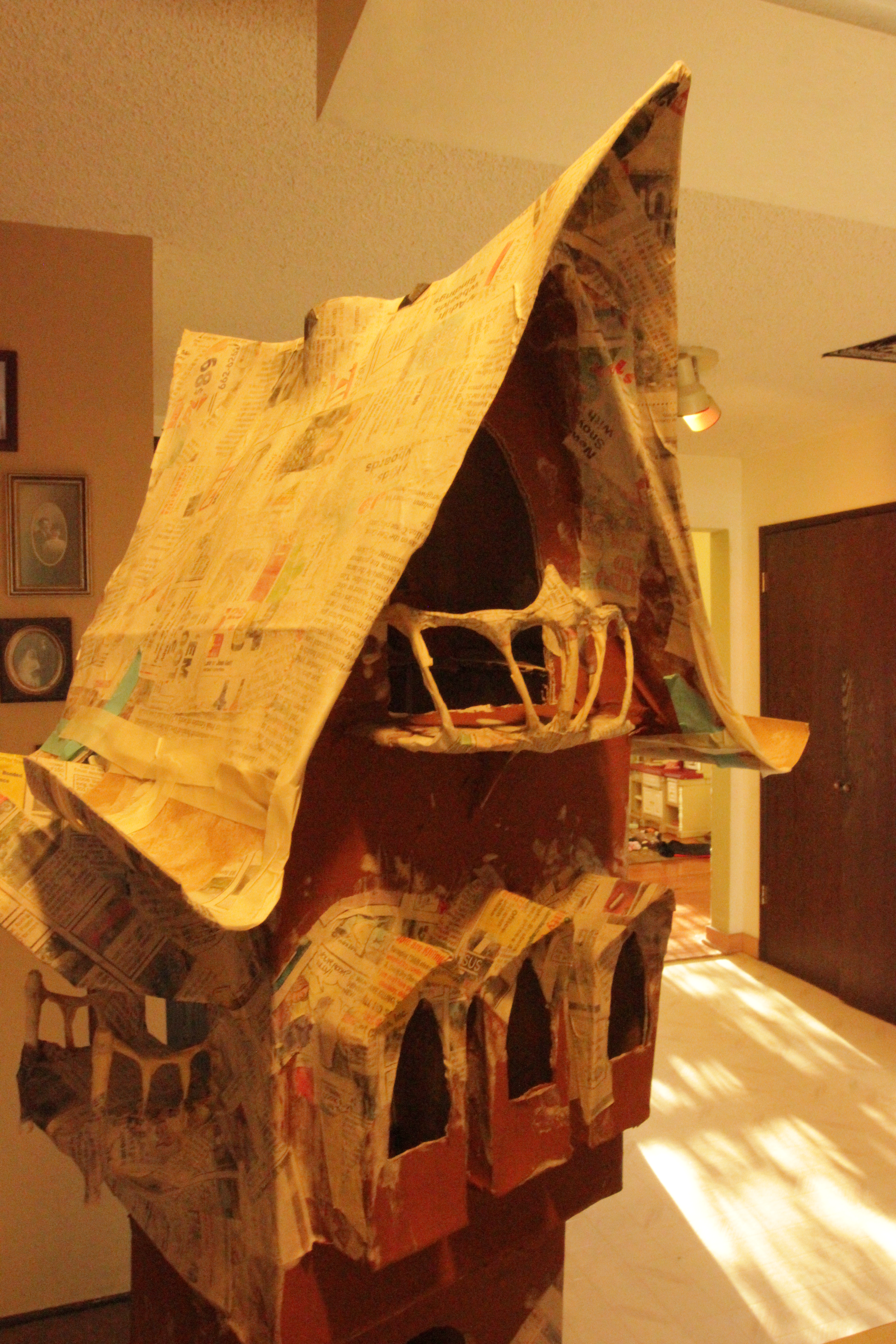 This fairy house was my first creation using boxes and paper mache. It is a sloooow process! (Wait, everything is a slow process when you have a little person helping you out π ) I just work on it when I can, and it is slowly coming along…