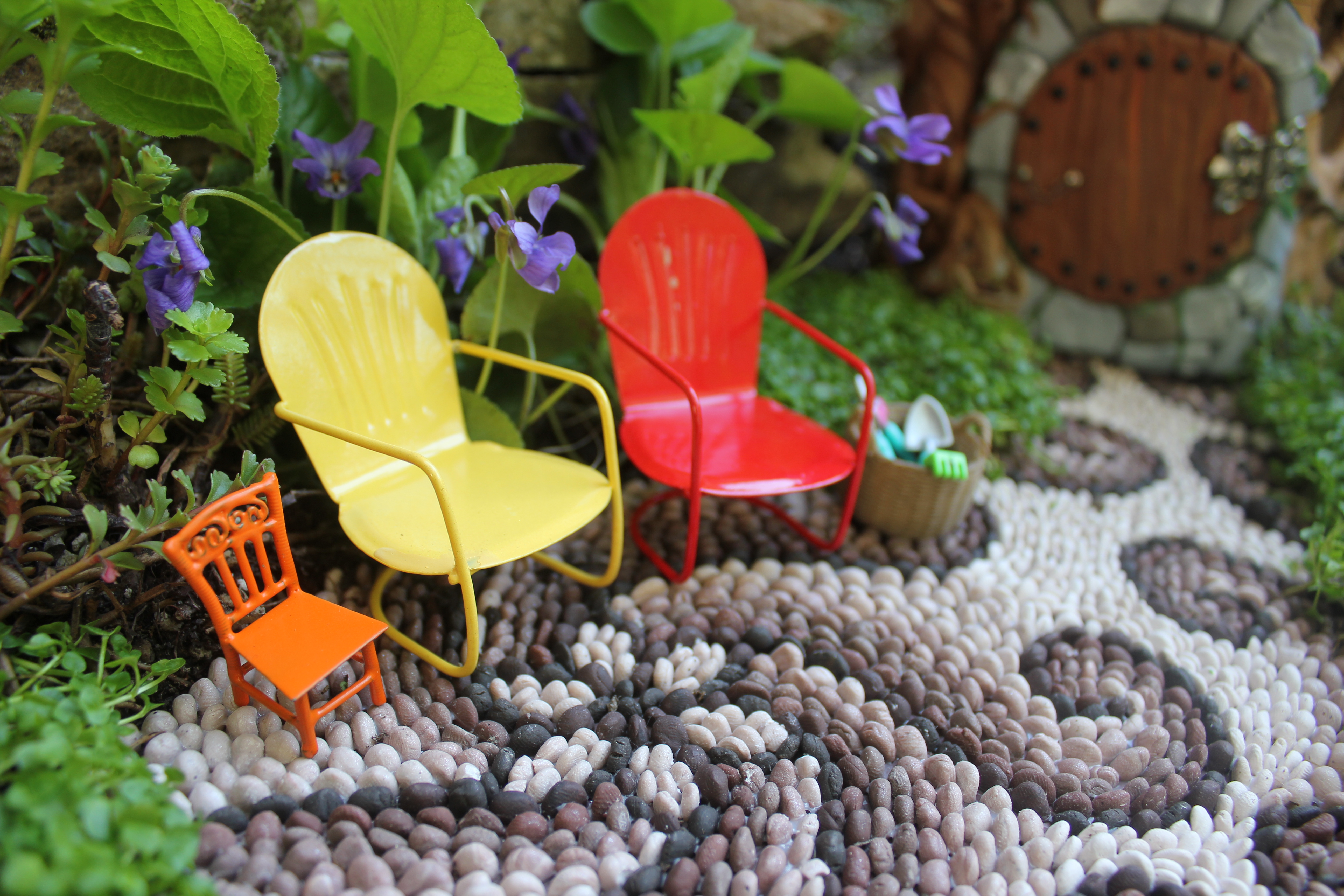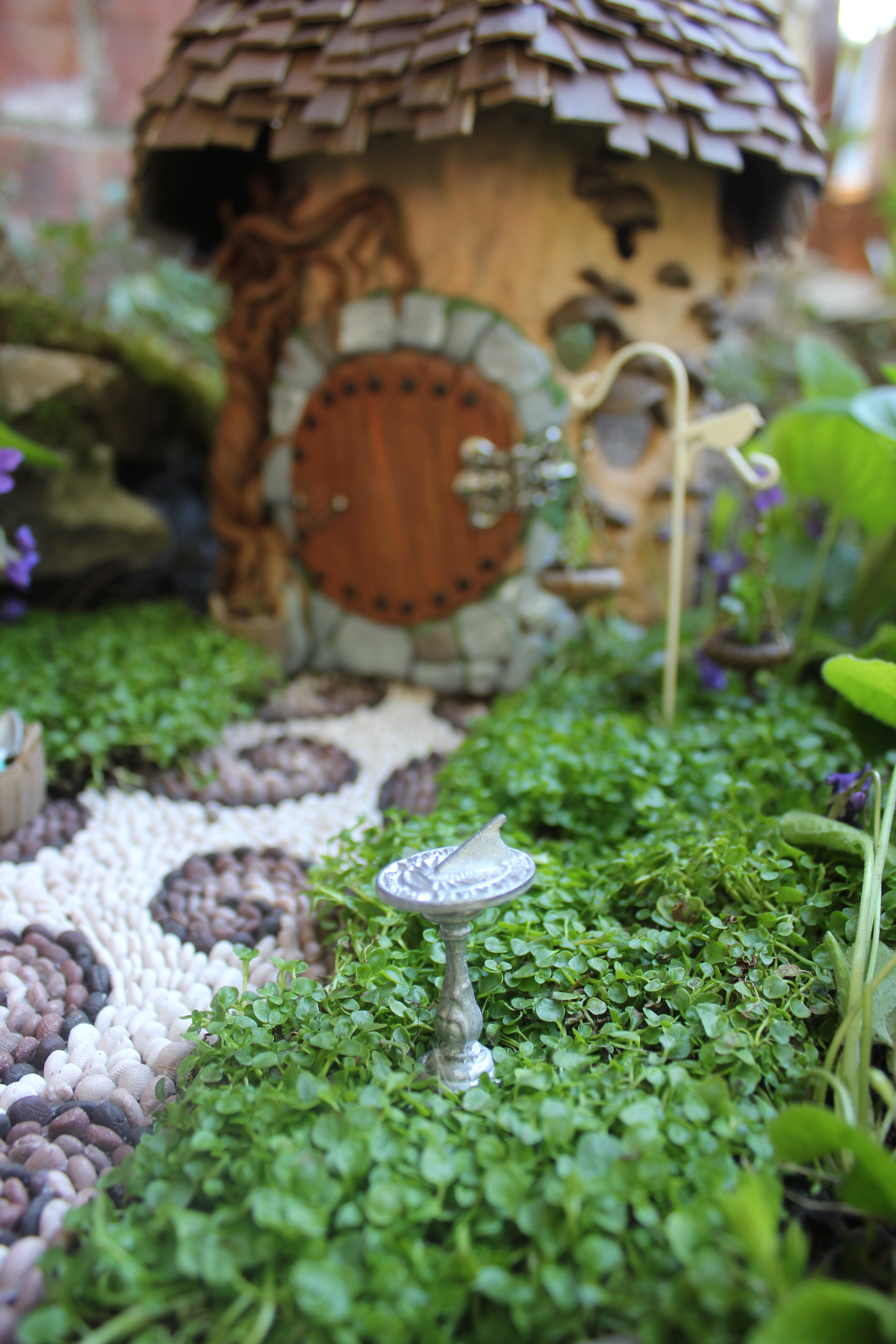 I landscaped with some succulents and violets that were already well established, then added some Corsican mint. I made a sitting area where mom, dad, and little one could sit and take a break after working hard in the garden 🙂