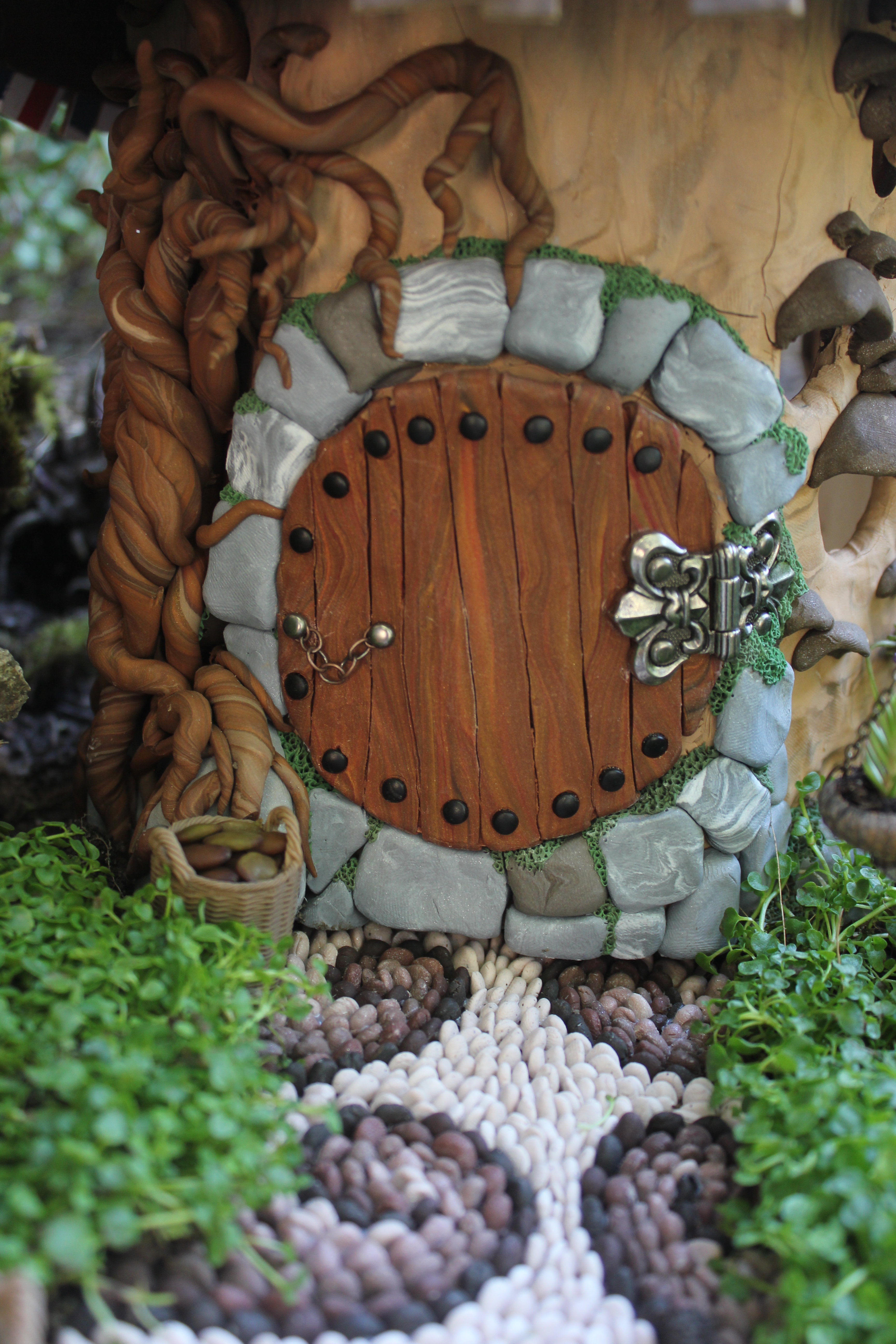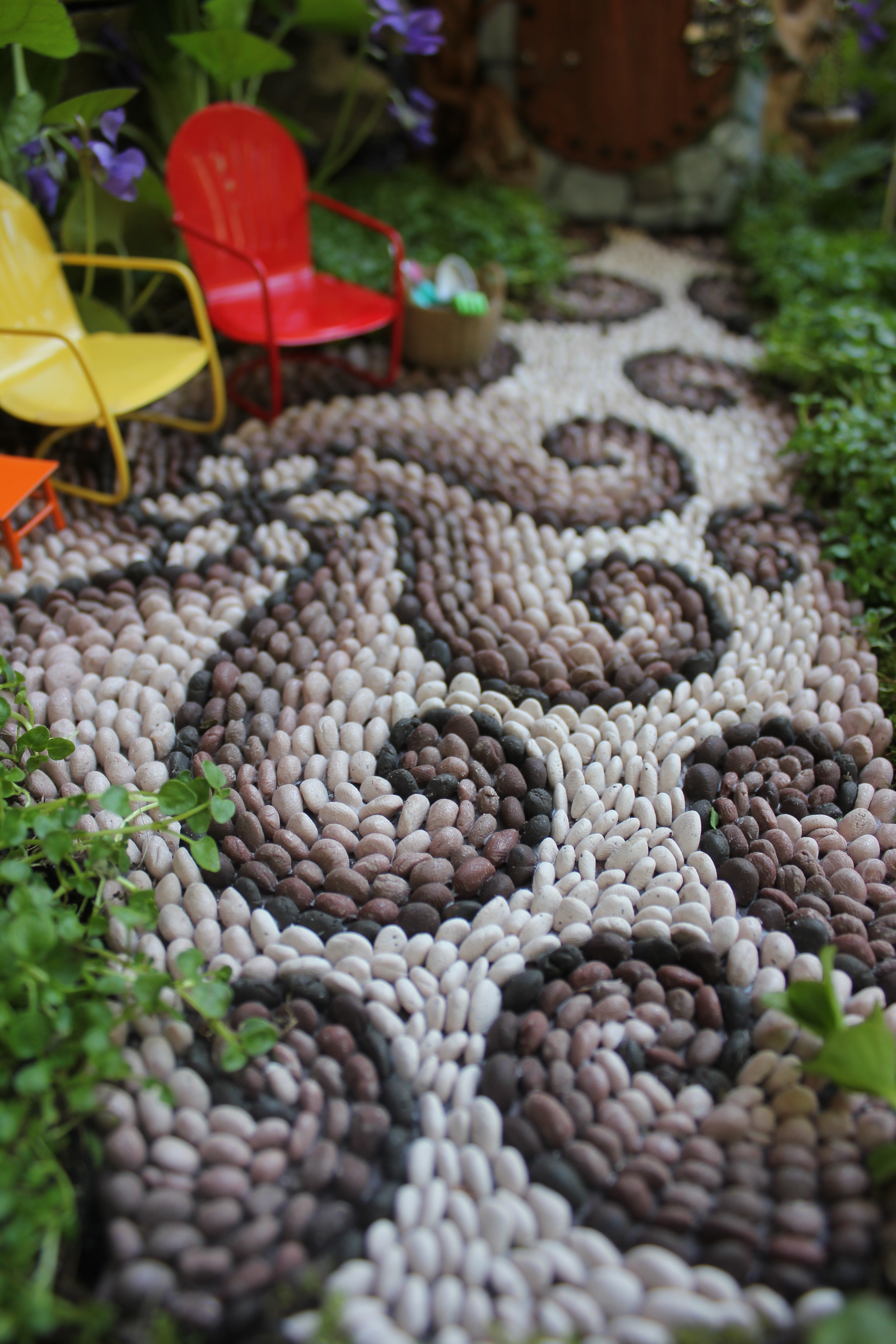 Last year I made a little “Hobbit House”, and wanted to have someplace outside where I could do some landscaping around it. I could just imagine the little people who might come and move in, and wanted to make it as nice as possible for them! One idea I always have wanted for my own garden is a pebble mosaic garden path. So rather than build one full sized, I decided my little fairy friends might like one too!