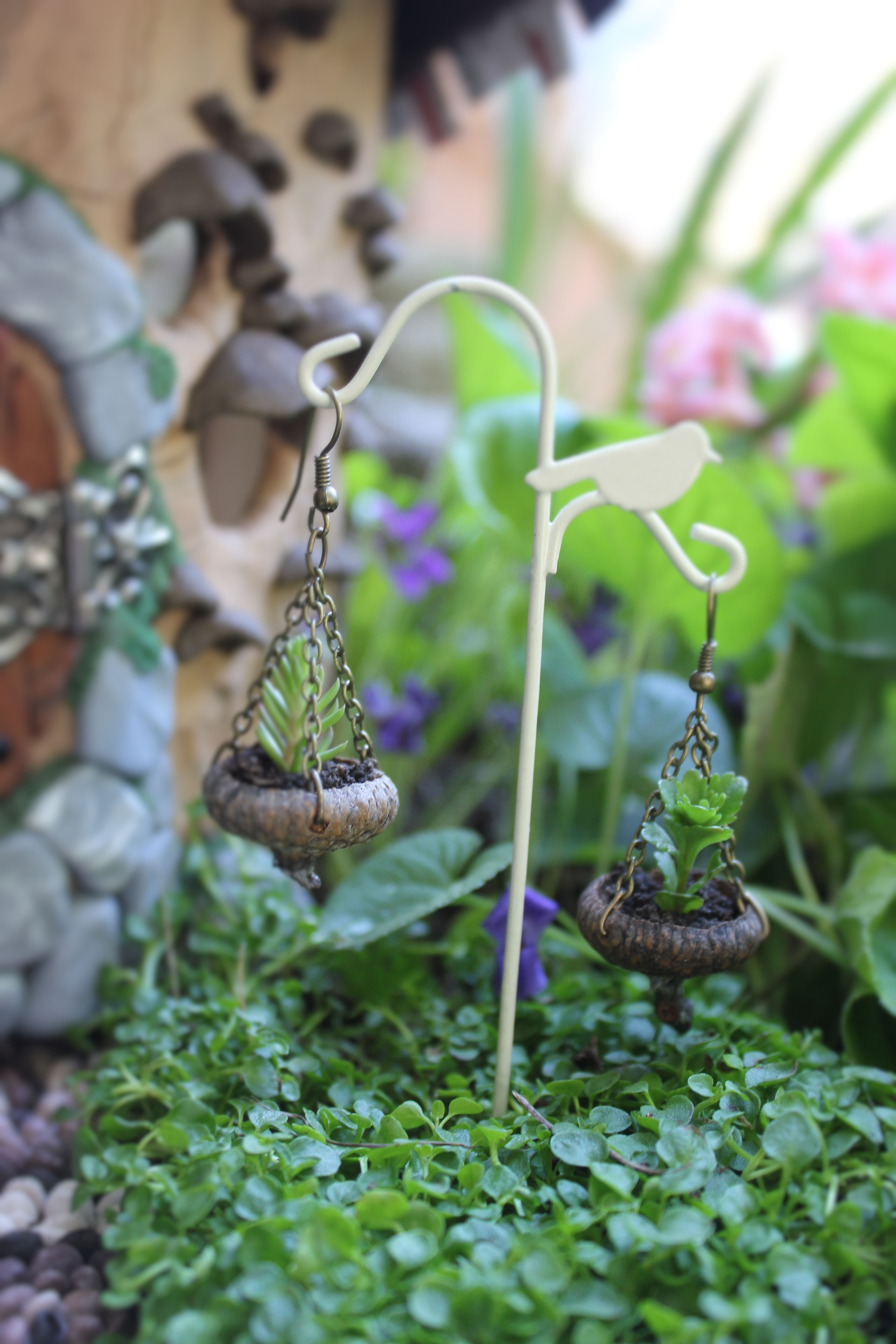 I made hanging baskets from acorn caps and planted little succulents inside.